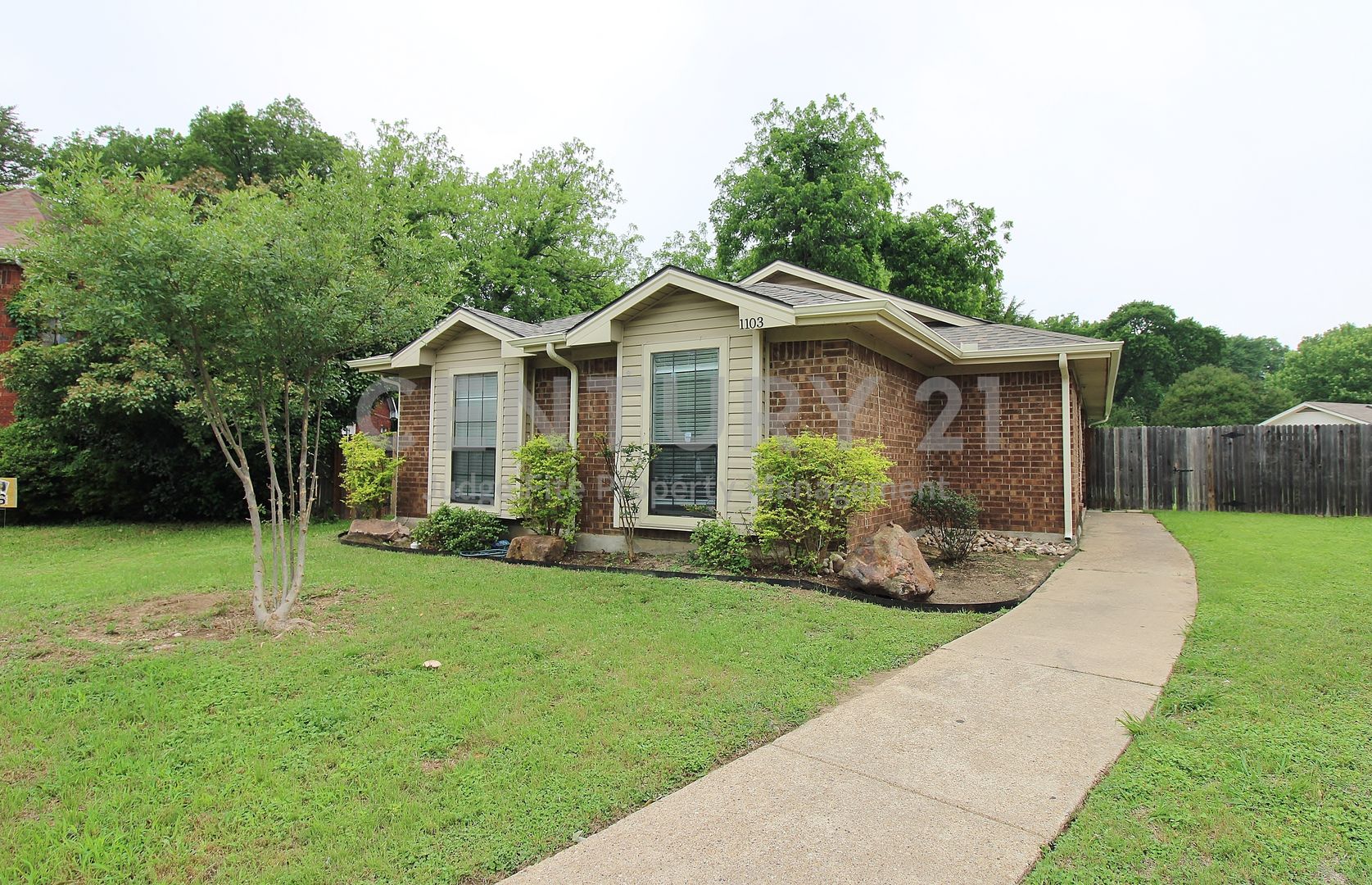 Welcome to this charming 3/2/2 home located at 1103 Hemlock Court. The exterior is complemented by lovely landscaping, mature trees and a fully fenced, expansive backyard that offers plenty of open green space for outdoor activities and relaxation. Open-concept living area with soaring vaulted ceilings and stylish wood-look flooring that flows seamlessly throughout the main spaces. The heart of the home is anchored by a floor-to-ceiling brick fireplace. The updated kitchen comes complete with a built-in microwave, dishwasher, disposal, stove and breakfast bar. The primary suite and additional bedrooms offer comfortable retreats with plush carpeting and ceiling fans. The bathrooms have been updated with decorative tile work in the shower and tub areas. This move-in-ready home combines functional living with modern updates, making it a fantastic opportunity in an established DeSoto neighborhood. Owner must approve all pets.