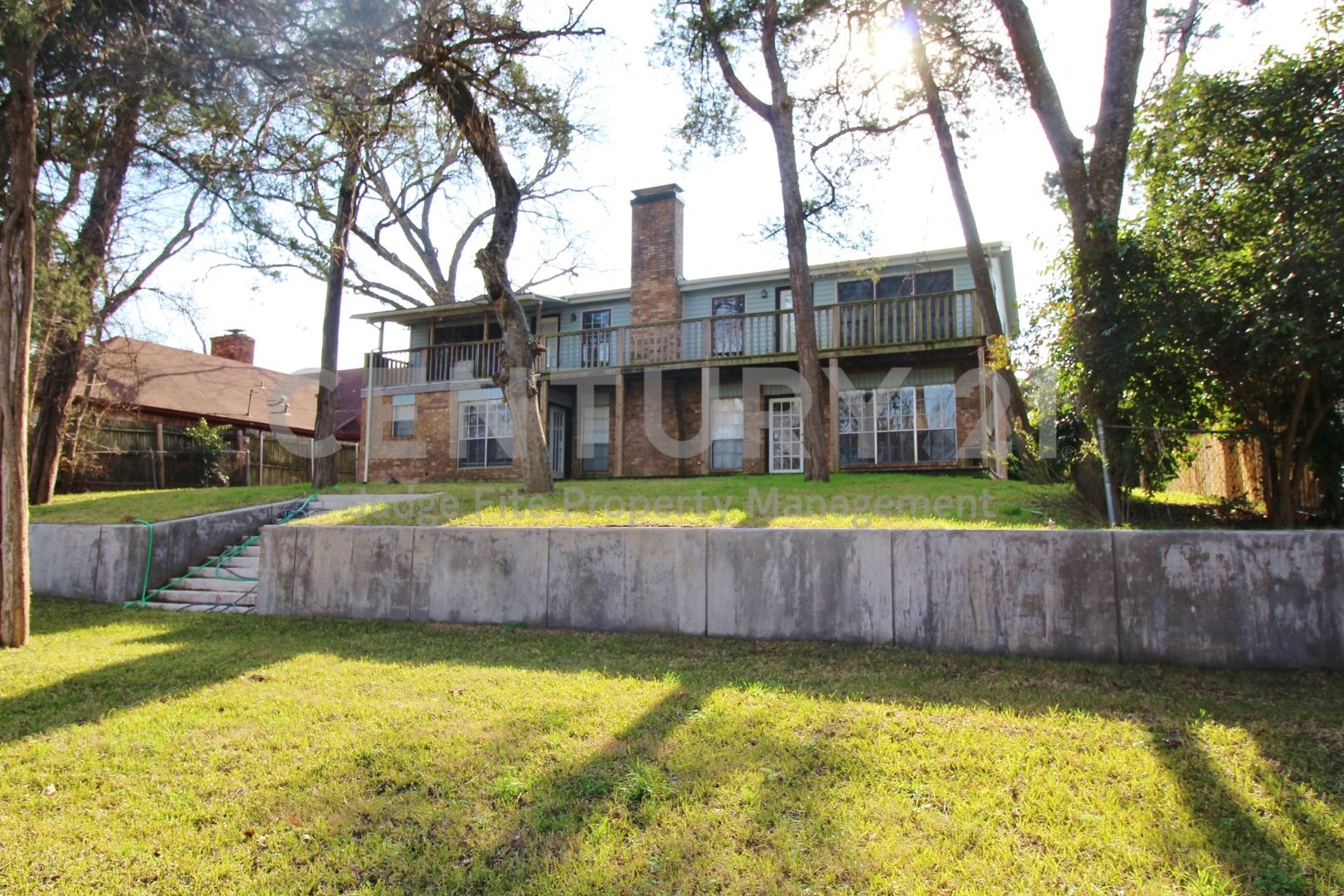 Welcome to this charming multi-level 4/2.5/2 home, offering a blend of spacious interiors and serene outdoor living. The two-story floor plan provides a sense of openness, with a unique layout perfect for both daily life and entertaining. A welcoming living area featuring a striking floor-to-ceiling brick fireplace, the perfect focal point for cozy evenings. Large windows flood the space with natural light, creating a bright and airy atmosphere. The durable LVP flooring extends seamlessly into the kitchen, which is designed for both functionality and style. It boasts ample cabinet space, a built-in microwave, dishwasher, and an electric stove. The U-shaped layout includes a large breakfast bar, providing extra counter space for meal prep or casual dining. The home offers a split bedroom design with four well-sized bedrooms, all with ceiling fans. The split primary bedroom features a private entrance to the back deck, with warm LVP flooring and a large window providing views of the backyard. The en-suite bath includes a spacious walk-in shower and a separate jetted tub, offering a true spa-like retreat. Step outside to discover the home's impressive exterior features. The backyard is a natural oasis, with a large, elevated deck perfect for grilling or relaxing while taking in the creek and wooded views. Stairs leads down to the expansive, fenced-in backyard, providing plenty of space for outdoor activities and gardening. This home combines comfort, style, and a great location, making it an excellent retreat. It's an ideal choice for anyone looking for a home that feels like a private sanctuary. Owner must approve all pets.