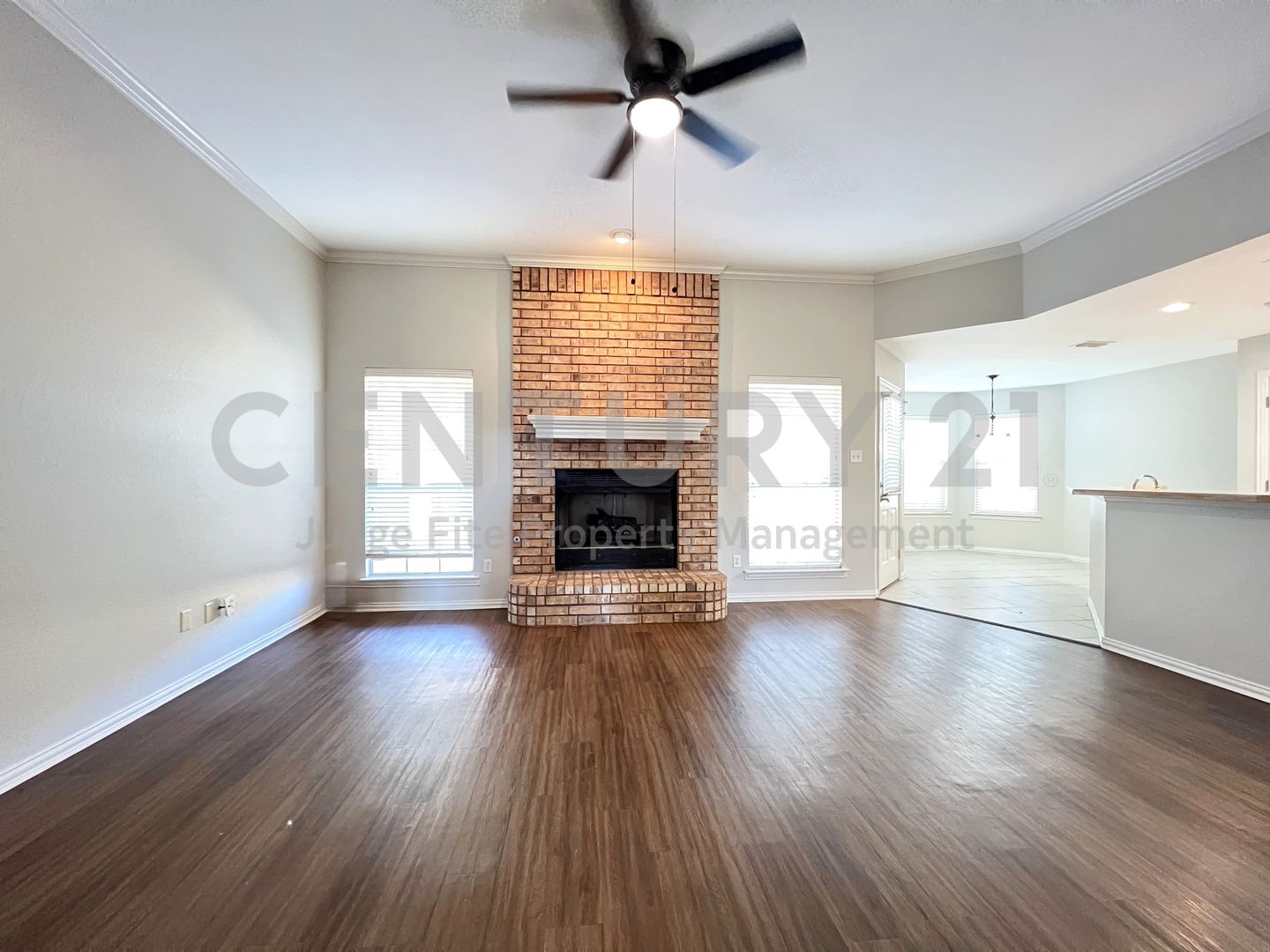 Spacious 4-bedroom, 2-bath home featuring an open floor plan and desirable split-bedroom design. Fresh paint throughout and hard-surface flooring in all rooms—no carpet. Light & bright living area flows seamlessly into the breakfast area and kitchen, perfect for everyday living and entertaining. The kitchen offers plenty of cabinet and counterspace along with a dishwasher, stove and refrigerator, and breakfast bar. The primary suite features a garden tub, separate shower, and walk-in closet. Fenced backyard with open patio and storage shed. Fireplace is inoperable and will not be repaired. Owner must approve all pets. 12 month lease term only.