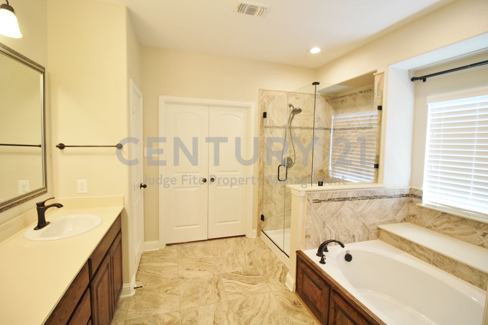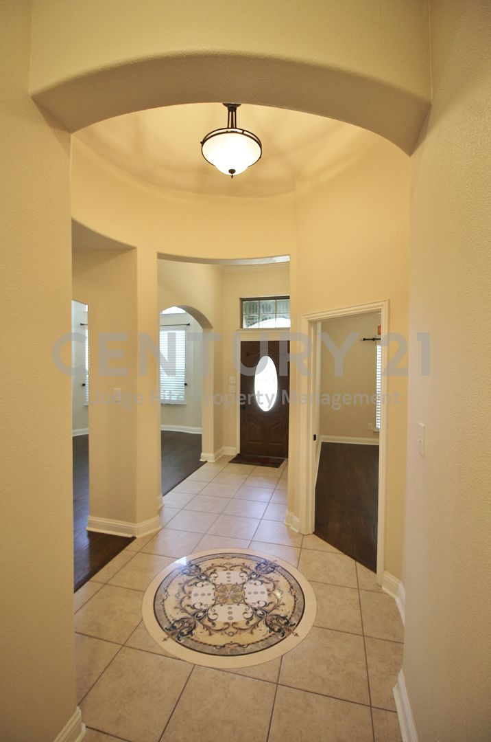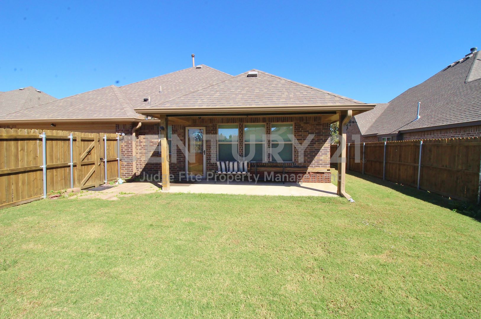 Welcome to this captivating single-story 3/2/2 residence, where stunning curb appeal meets comfortable, modern living. The impressive stone and brick facade, framed by mature trees and vibrant landscaping, sets a welcoming tone. Step inside the grand entryway, featuring a designer tile mosaic that leads into an inviting, open-concept floor plan. The home boasts a blend of elegant tile and rich, wood flooring throughout. The chef's kitchen is a true focal point, featuring beautiful granite countertops, custom cabinetry, tiled backsplash, and stainless steel appliances. The large, tiered island with a double sink is perfect for prepping and entertaining, offering a seamless view into the main living area, making entertaining easy. Retreat to the serene primary suite, offering ample space and lots of natural light. The en-suite bathroom is a spa-like escape, complete with an expansive double vanity, a separate glass-enclosed shower, and a deep soaking tub surrounded by elegant tile work. Enjoy the tranquil, fully fenced backyard, featuring a covered patio great for outdoor dining and relaxation. This home offers access to an array of resort-style amenities. Residents can enjoy the community clubhouse, a refreshing pool, and multiple courts for sports enthusiasts, including basketball, pickleball, and tennis courts. Take advantage of the scenic walking trails that wind around gorgeous ponds, perfect for evening strolls and outdoor activity. No pets please. 12 month lease term only.