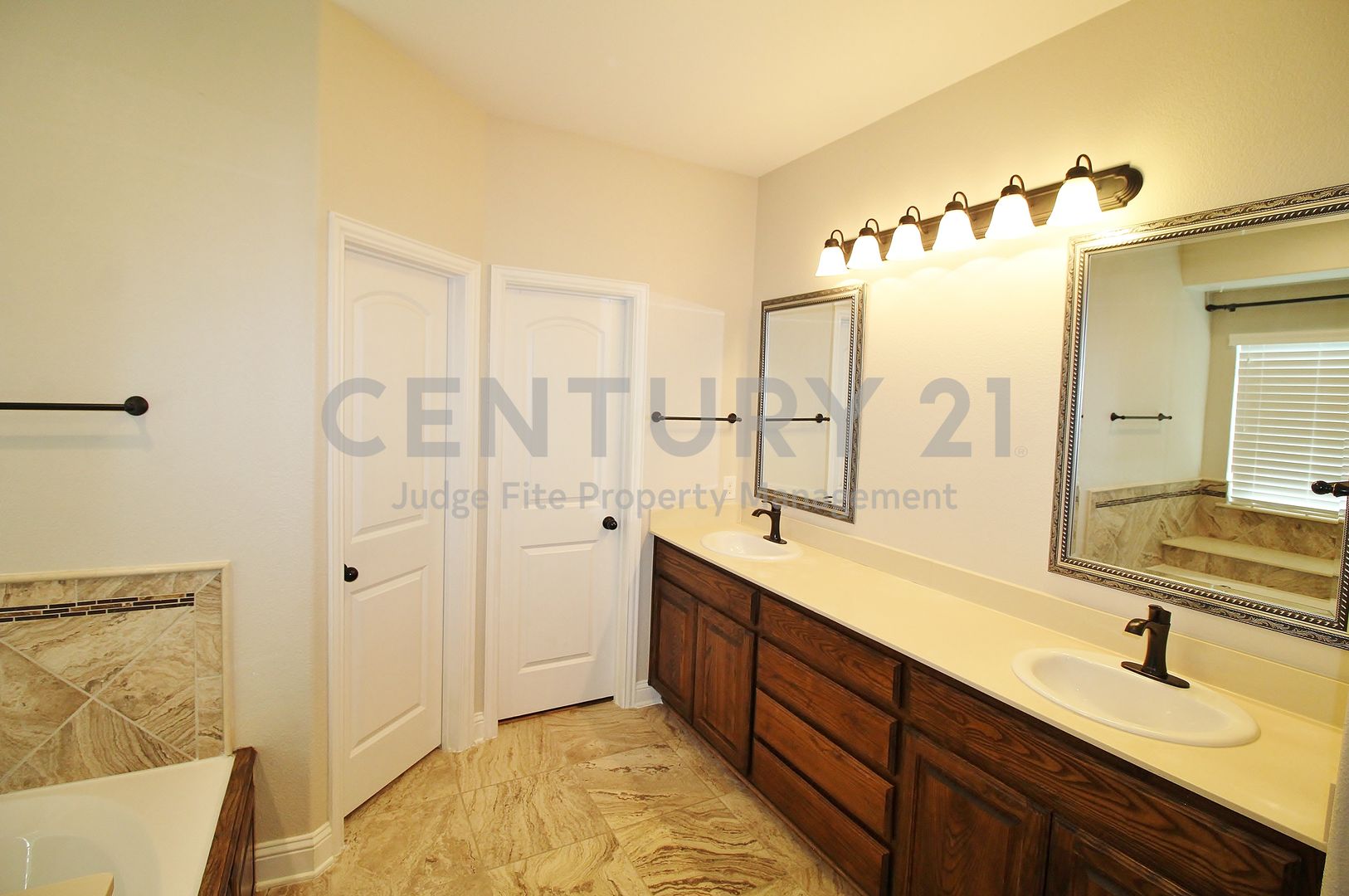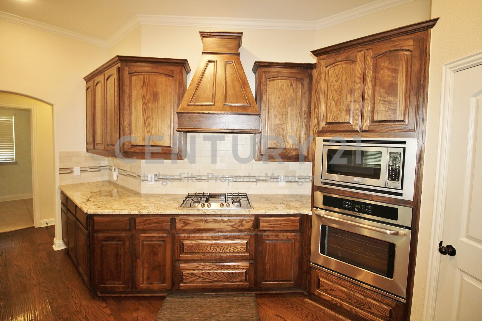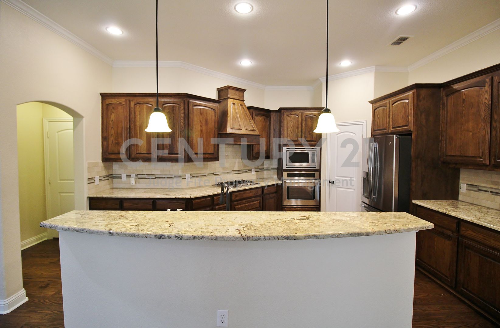 Welcome to this captivating single-story 3/2/2 residence, where stunning curb appeal meets comfortable, modern living. The impressive stone and brick facade, framed by mature trees and vibrant landscaping, sets a welcoming tone. Step inside the grand entryway, featuring a designer tile mosaic that leads into an inviting, open-concept floor plan. The home boasts a blend of elegant tile and rich, wood flooring throughout. The chef's kitchen is a true focal point, featuring beautiful granite countertops, custom cabinetry, tiled backsplash, and stainless steel appliances. The large, tiered island with a double sink is perfect for prepping and entertaining, offering a seamless view into the main living area, making entertaining easy. Retreat to the serene primary suite, offering ample space and lots of natural light. The en-suite bathroom is a spa-like escape, complete with an expansive double vanity, a separate glass-enclosed shower, and a deep soaking tub surrounded by elegant tile work. Enjoy the tranquil, fully fenced backyard, featuring a covered patio great for outdoor dining and relaxation. This home offers access to an array of resort-style amenities. Residents can enjoy the community clubhouse, a refreshing pool, and multiple courts for sports enthusiasts, including basketball, pickleball, and tennis courts. Take advantage of the scenic walking trails that wind around gorgeous ponds, perfect for evening strolls and outdoor activity. No pets please. 12 month lease term only.