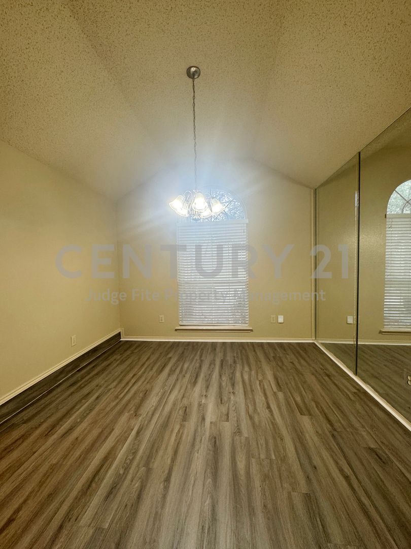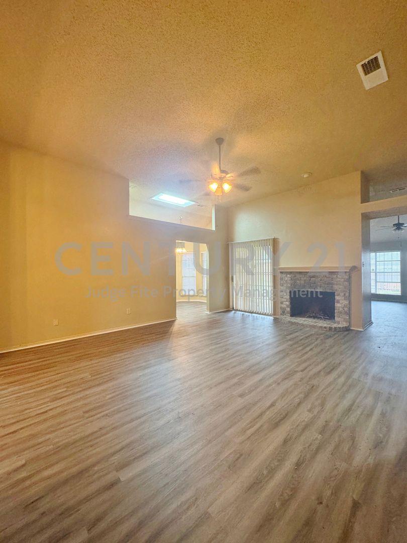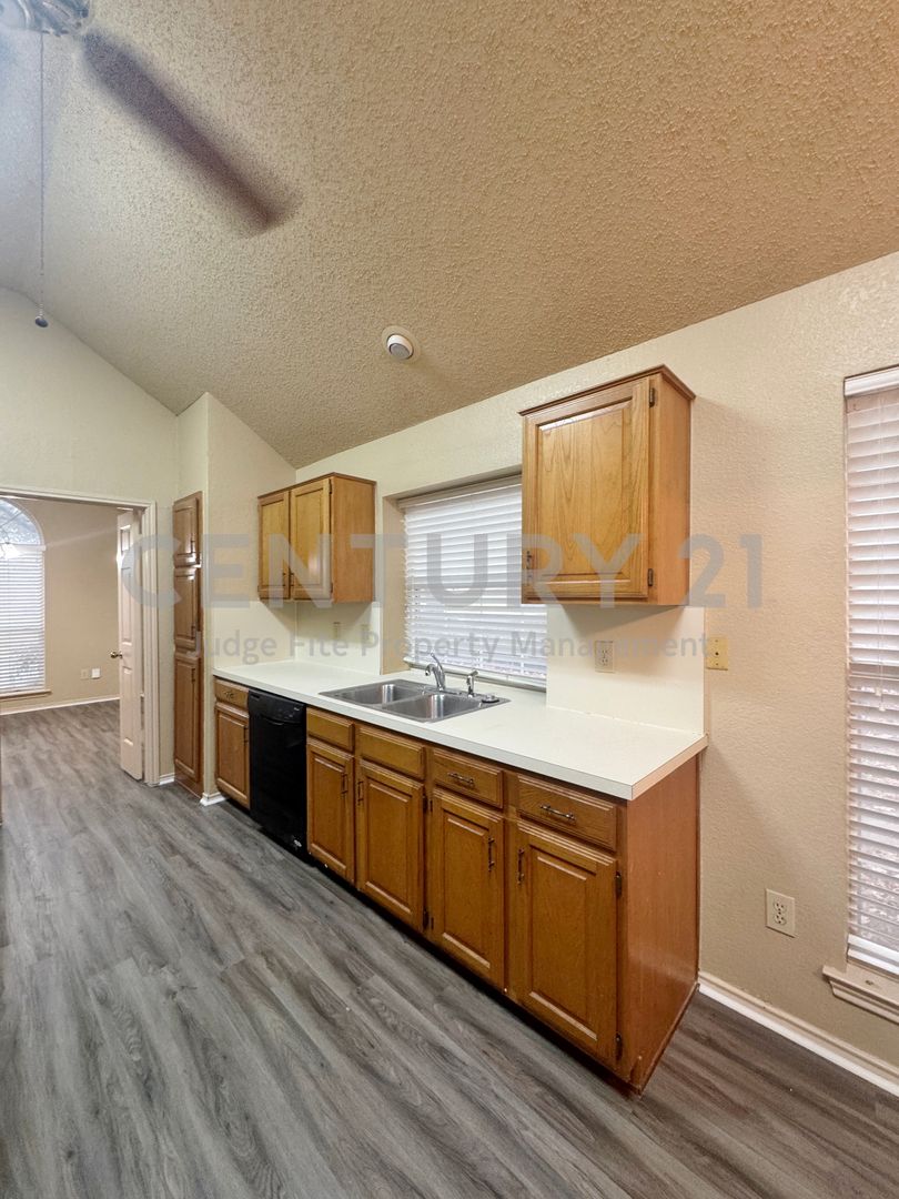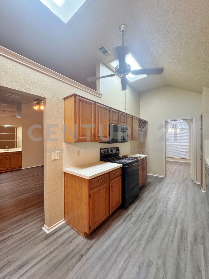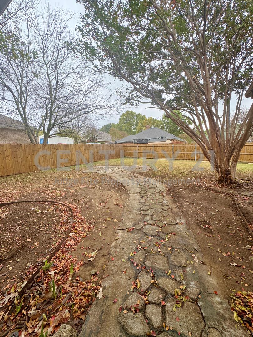Discover this lovely single-story 3/2/2 home, perfectly situated on a nicely treed lot in established neighborhood. The vaulted ceilings in the living area, kitchen, and dining areas, along with a skylight in the kitchen, create an open, illuminated atmosphere. The main living area features a cozy brick fireplace and a wet bar, great for entertaining. The kitchen boasts classic wood cabinetry, and black appliances including a built-in microwave, dishwasher, and stove. An adjoining breakfast nook offers a charming bay window for casual meals. Retreat to the generously sized primary bedroom. The en-suite bathroom includes a double vanity, a separate tub, and walk-in closet. The property features a fenced backyard with mature trees, offering privacy and shade, and a unique flagstone-style walkway. A covered back porch provides a shaded spot to relax or entertain outdoors. With its excellent curb appeal, and well-maintained condition, this home is ready for you! Don't miss the opportunity to make this beautiful property yours. No pets please.
