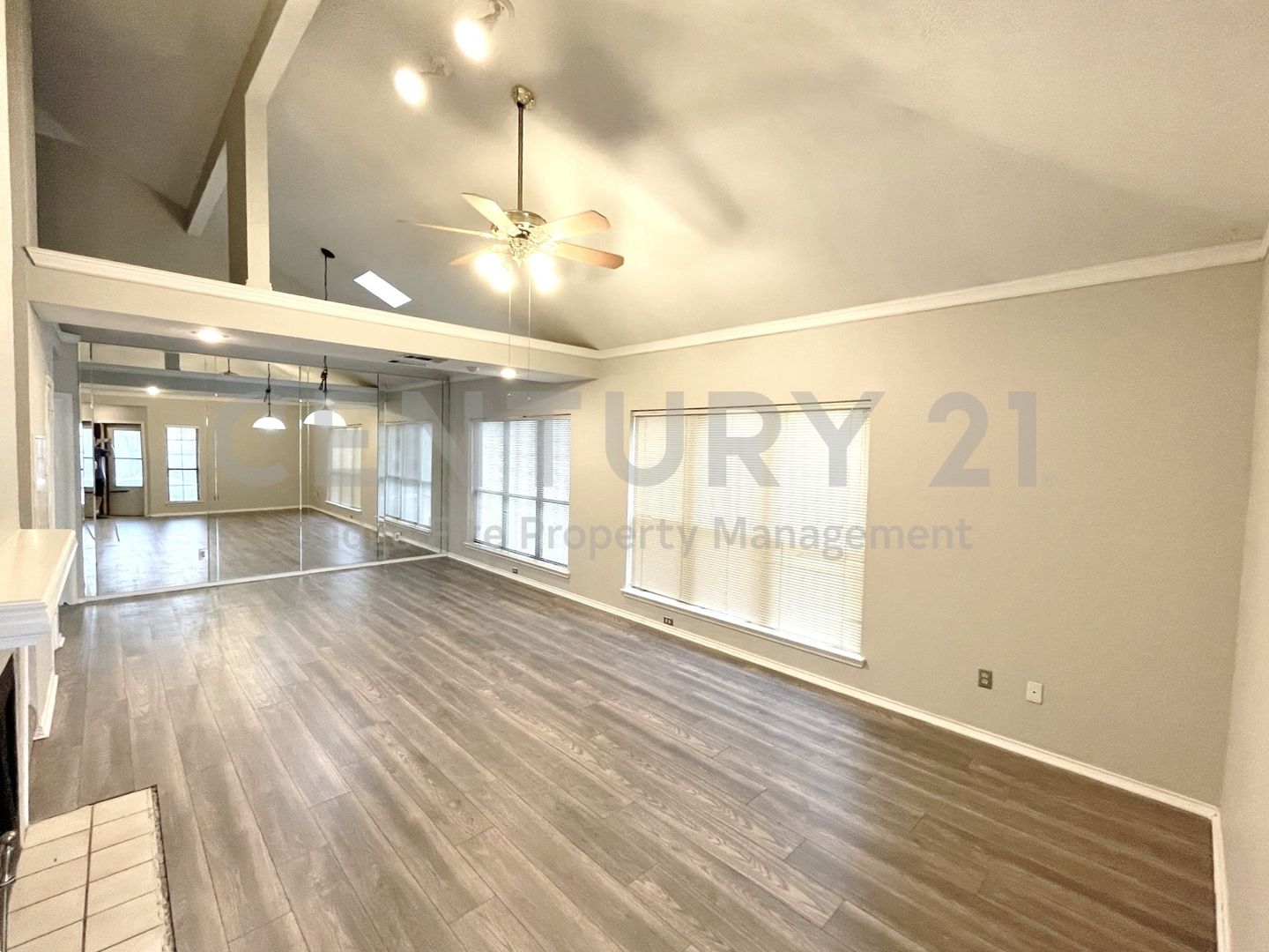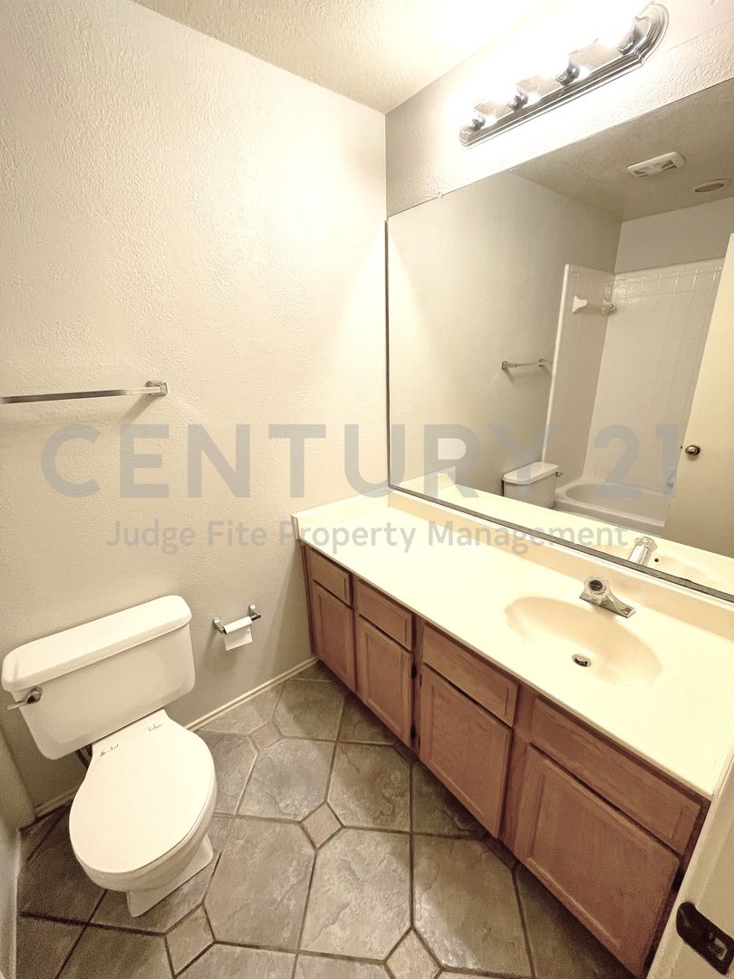 Welcome to your next home! This beautiful 2-story 3/2.5/2 residence offers a blend of classic charm and modern updates, providing a comfortable and stylish living experience. Great for anyone seeking a spacious and bright atmosphere. Step into a welcoming space featuring stunning vaulted ceilings, and attractive wood-look flooring. A cozy fireplace provides a focal point, and the mirrored accent wall adds a touch of modern flair. The functional kitchen boasts extensive dark wood cabinetry, providing ample storage, and stainless steel appliances, including a built-in microwave, dishwasher, stove and refrigerator. The primary bedroom is generously sized with plush carpeting, crown molding, and an en-suite bath. The updated primary bathroom features separate vanities, a tiled walk-in shower, and modern fixtures. Secondary bedrooms are spacious, feature comfortable carpeting, and neutral paint colors, ready for any decor. Enjoy outdoor living with a fully fenced-in backyard, which includes a small wooden deck, perfect for grilling, and a storage shed for your tools and equipment. Don't miss the opportunity to lease this fantastic home! Contact us today to schedule a viewing. Only pets under 75lbs allowed with owner approval.