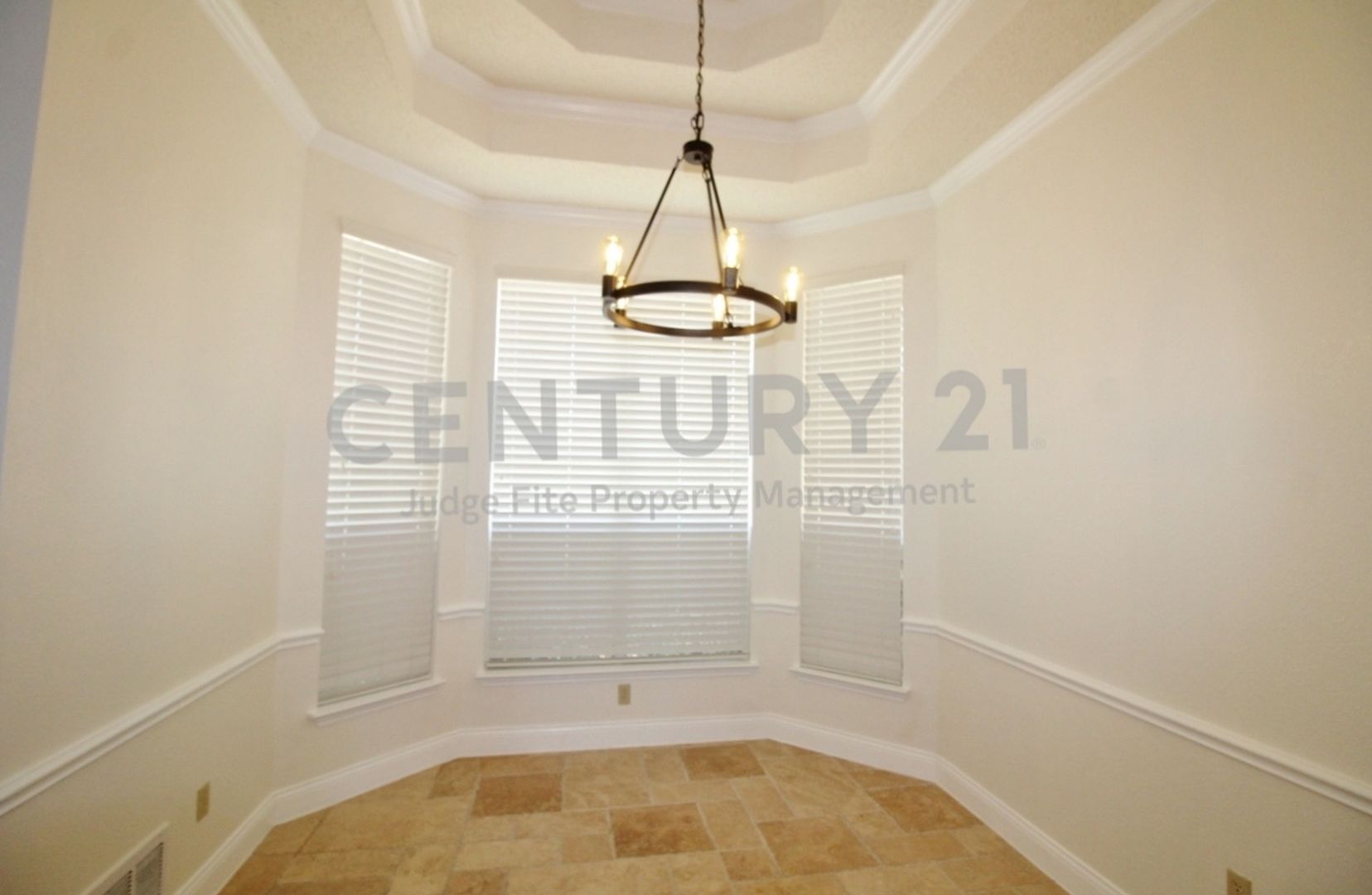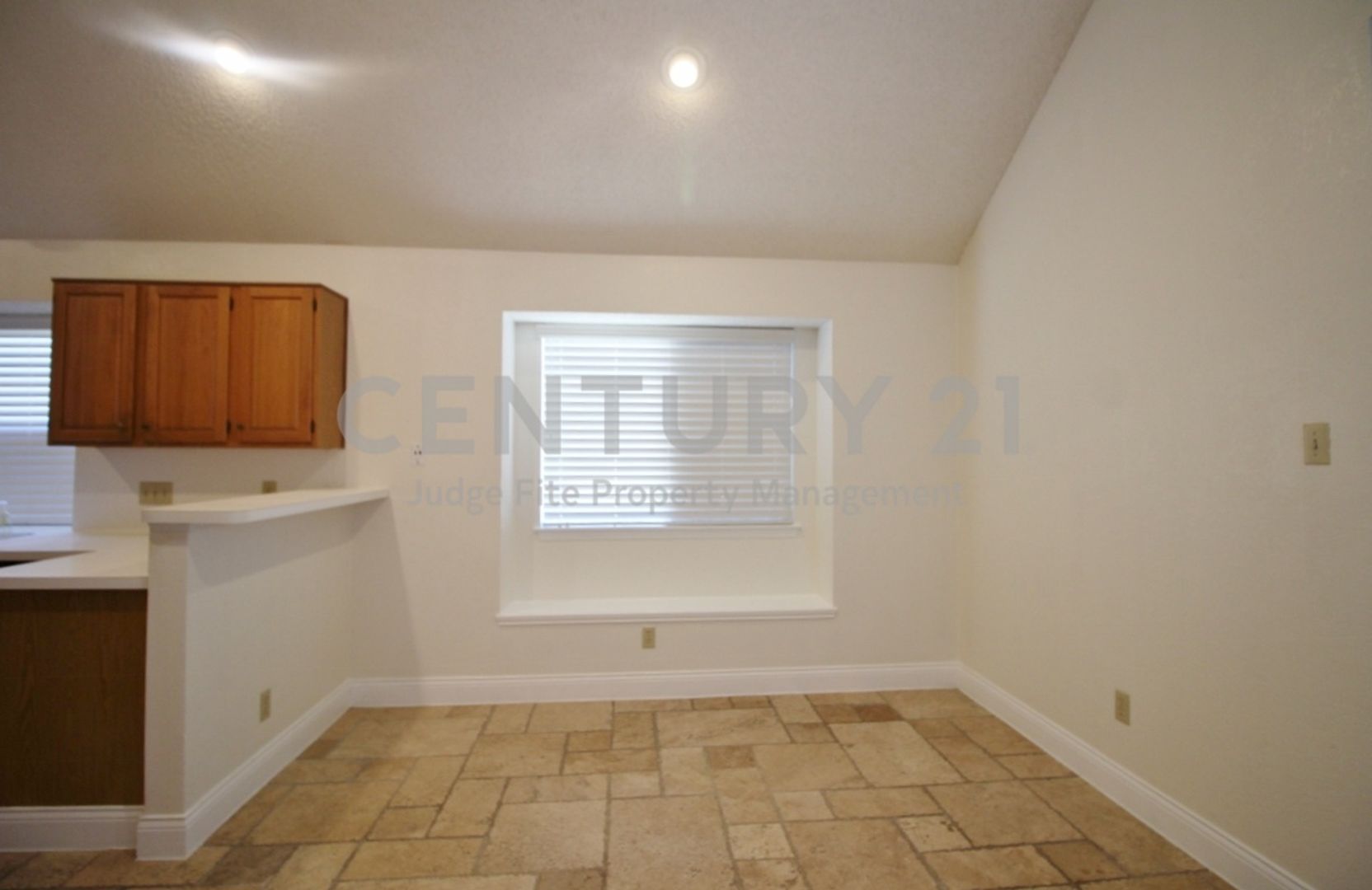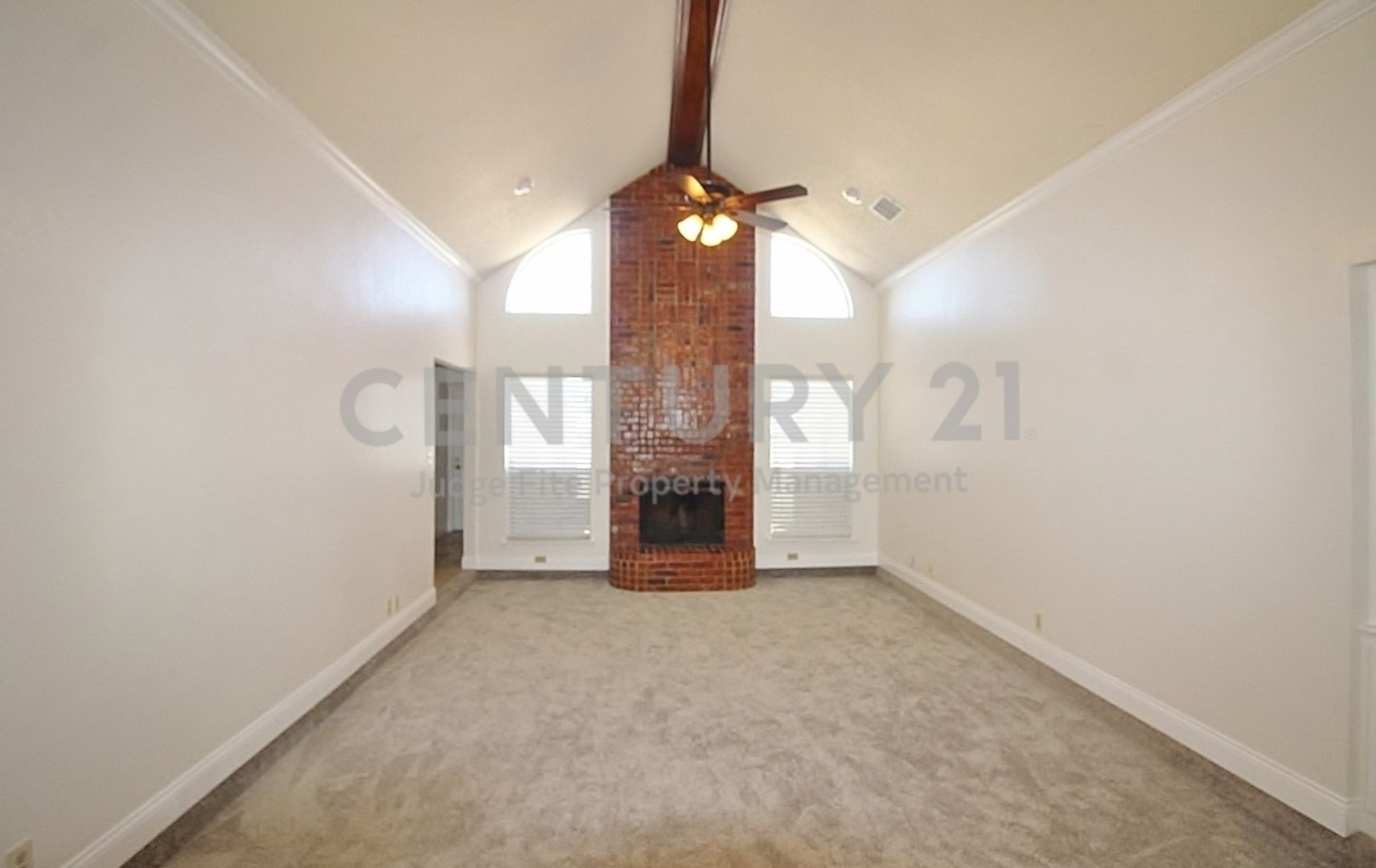 This beautiful brick 3/2/2 residence offers a fantastic layout and desirable features throughout. From the spacious living room with its vaulted ceiling, skylights, and floor-to-ceiling brick fireplace, to the lovely primary suite, this home is ready for your personal touches. Front entry leads to the elegant formal dining, defined by a tray ceiling, decorative wainscoting, and a stylish chandelier, with ample natural light from the bay windows. The living area features a focal point fireplace and large arched windows create a stunning and inviting atmosphere. The kitchen offers lots of cabinet and counter space along with appliances including a built-in microwave, dishwasher, disposal and stove. Your spacious primary suite boasts vaulted ceilings, plush carpet, and great natural light. The primary bathroom includes separate vanities, jetted tub. separate shower and walk-in closet. A private backyard patio area is perfect for outdoor enjoyment, and the property includes a detached rear-entry garage. This home offers a perfect blend of comfort and style in a desirable location. Come see all the wonderful features this home has to offer! No pets please.