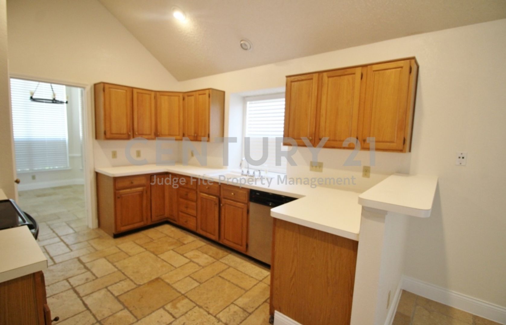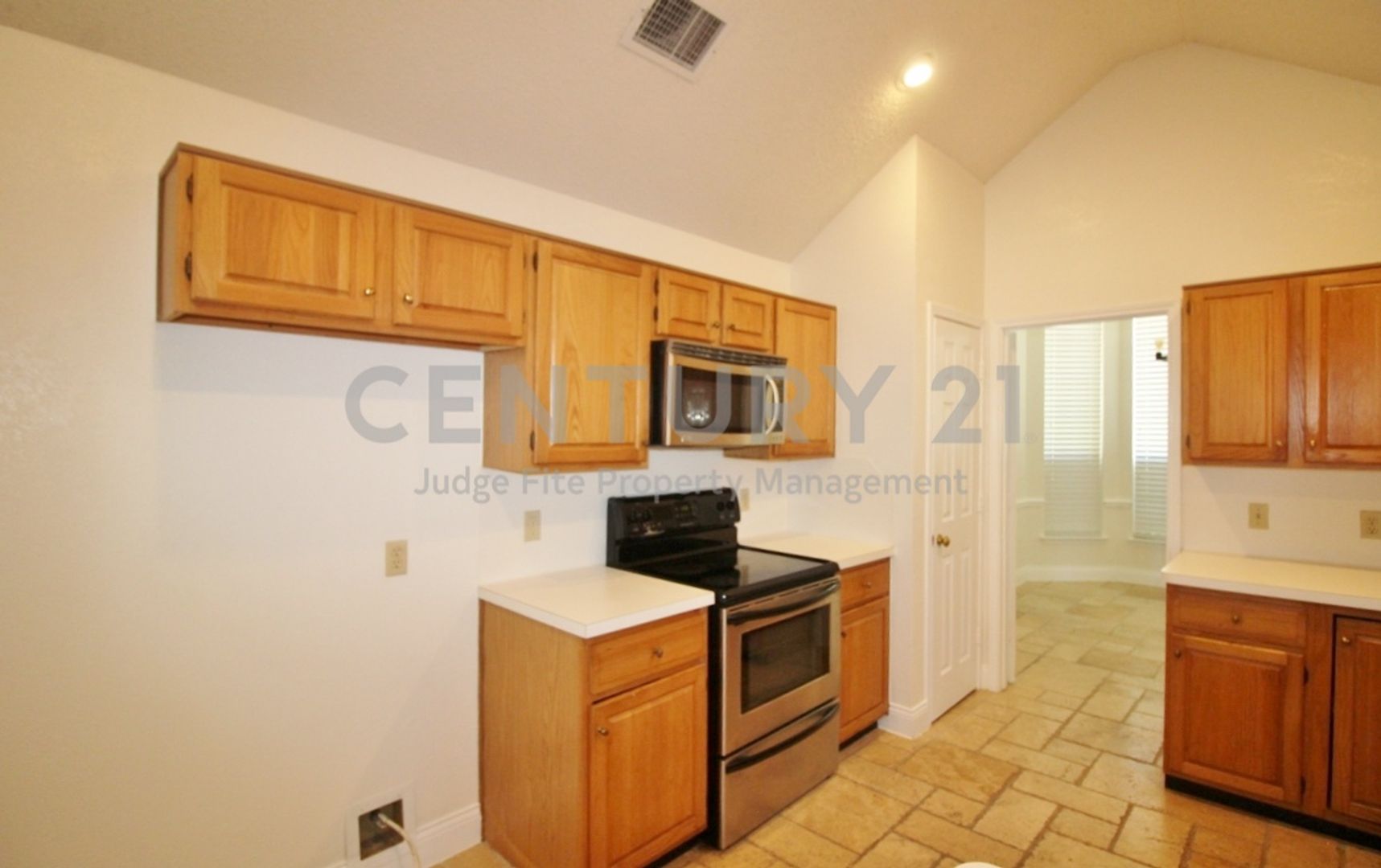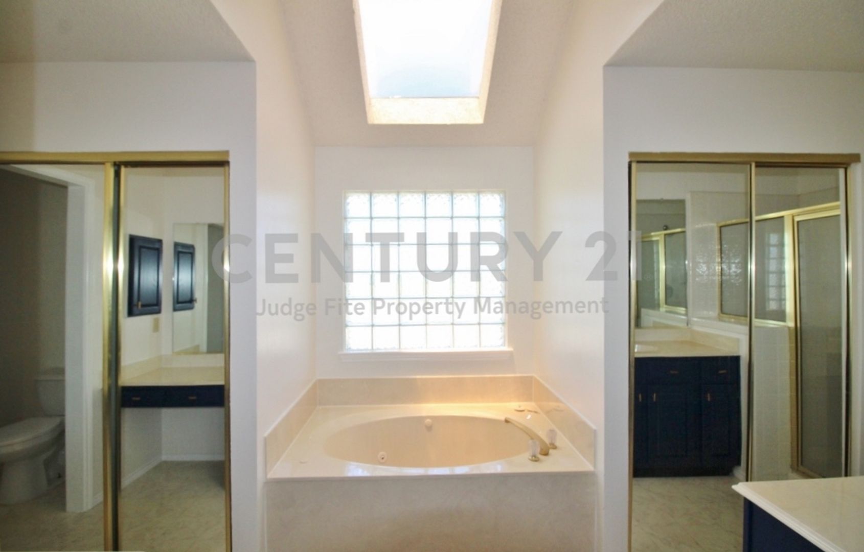 This beautiful brick 3/2/2 residence offers a fantastic layout and desirable features throughout. From the spacious living room with its vaulted ceiling, skylights, and floor-to-ceiling brick fireplace, to the lovely primary suite, this home is ready for your personal touches. Front entry leads to the elegant formal dining, defined by a tray ceiling, decorative wainscoting, and a stylish chandelier, with ample natural light from the bay windows. The living area features a focal point fireplace and large arched windows create a stunning and inviting atmosphere. The kitchen offers lots of cabinet and counter space along with appliances including a built-in microwave, dishwasher, disposal and stove. Your spacious primary suite boasts vaulted ceilings, plush carpet, and great natural light. The primary bathroom includes separate vanities, jetted tub. separate shower and walk-in closet. A private backyard patio area is perfect for outdoor enjoyment, and the property includes a detached rear-entry garage. This home offers a perfect blend of comfort and style in a desirable location. Come see all the wonderful features this home has to offer! No pets please.