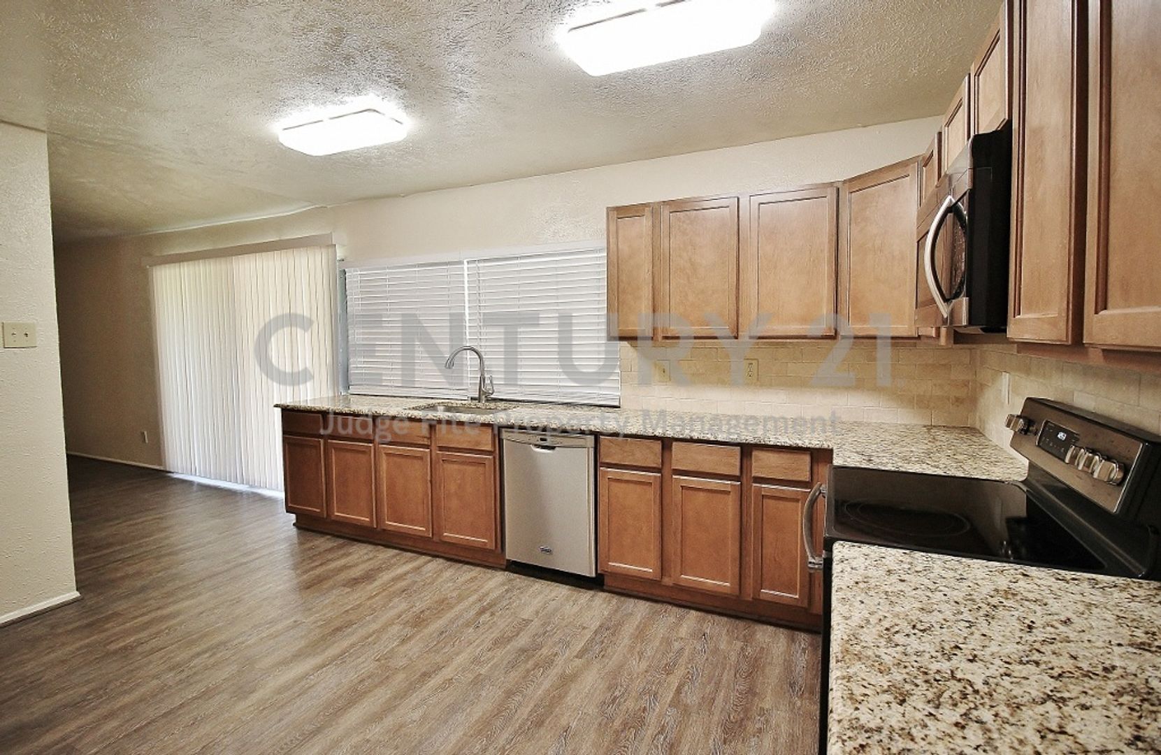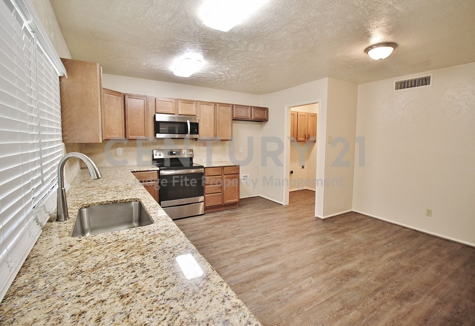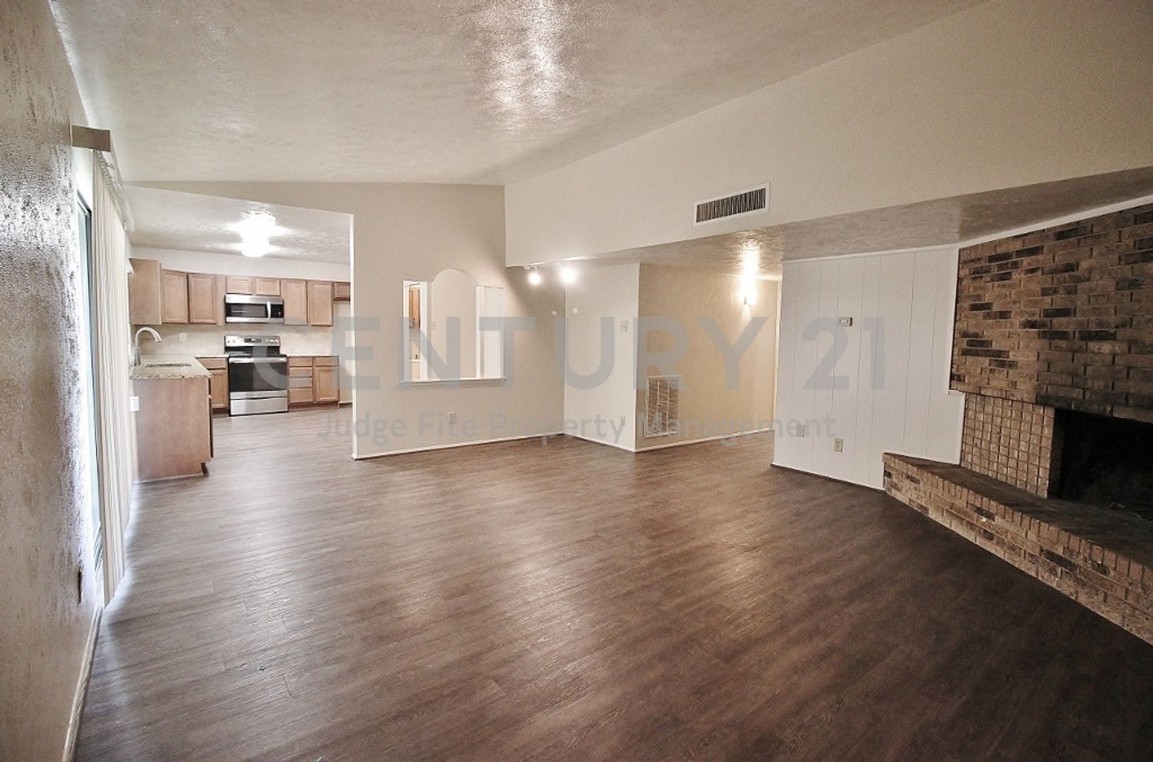 This charming 3/2/2 home offers a perfect blend of comfort and function, making it an ideal choice. The spacious living room, featuring a brick fireplace and a vaulted ceiling, is a welcoming space for relaxing or entertaining. Just off the living area, you'll find the modern kitchen, complete with granite countertops, stainless steel appliances, and ample cabinet space. The durable wood-look flooring throughout the main living areas adds a touch of warmth and is easy to maintain. The bedrooms are good-sized and feature ceiling fans and neutral carpeting. Your primary suite is a comfortable retreat with a clean, functional bathroom that includes a walk-in shower. The large, fenced-in backyard provides a great space for family fun, and the covered patio is perfect for outdoor dining and entertaining. With its combination of inviting indoor spaces and a fantastic outdoor area, this home is ready for your personal touches! Owner must approve all pets.