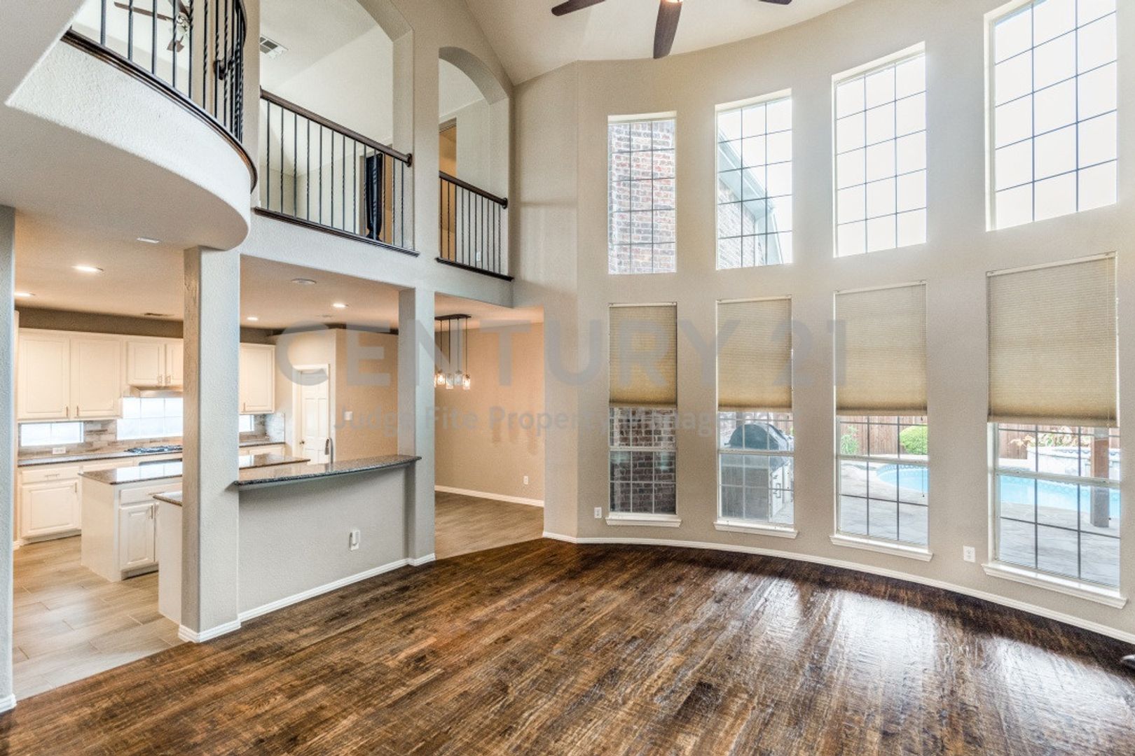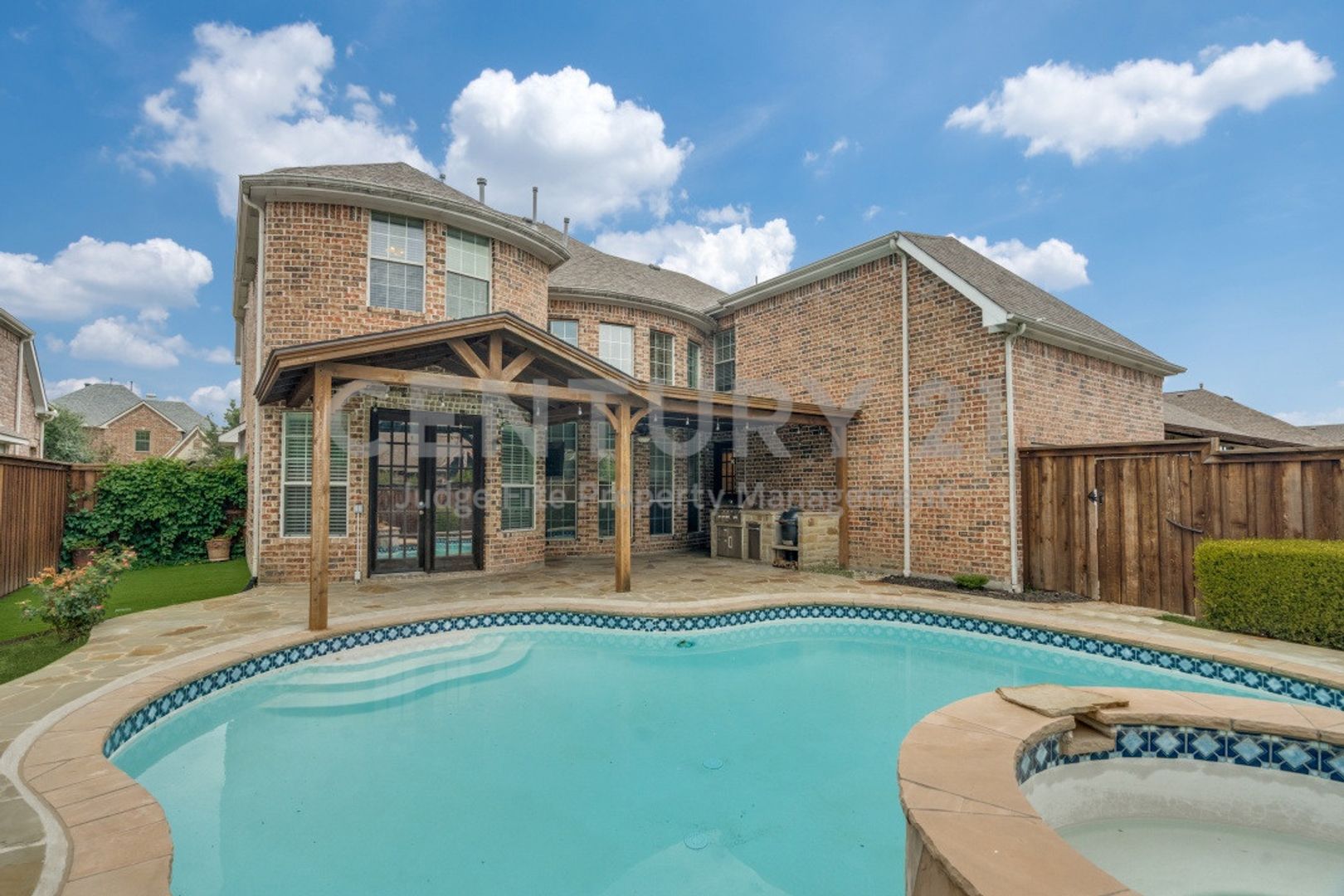 Stunning 2-story 4/3/2 in Frisco! Beautiful handscraped hardwoods, iron staircase railing, soaring ceilings and upgraded fixtures throughout. Enjoy the open floorplan with primary bedroom, office and two living areas down. Upstairs has 3 guest bedrooms - 1 with patio access to the terrace, media room and game room with wet bar. Upstairs overlooks the family room and pool. Light & bright family room with 2-story ceilings and a gas fireplace. Crisp and clean island kitchen with granite countertops and stainless steel appliance package. The primary suite will pamper you with its his n' hers vanities, garden tub and separate shower. Your backyard oasis awaits with a heated in-ground pool, attached hot tub and covered patio with outdoor kitchen. Walking distance to Allen Elementary and Legacy Christian Academy. Easy access to DNT, 121, the Star, Shops of Legacy and downtown Frisco. Only 1 pet allowed with owner approval.