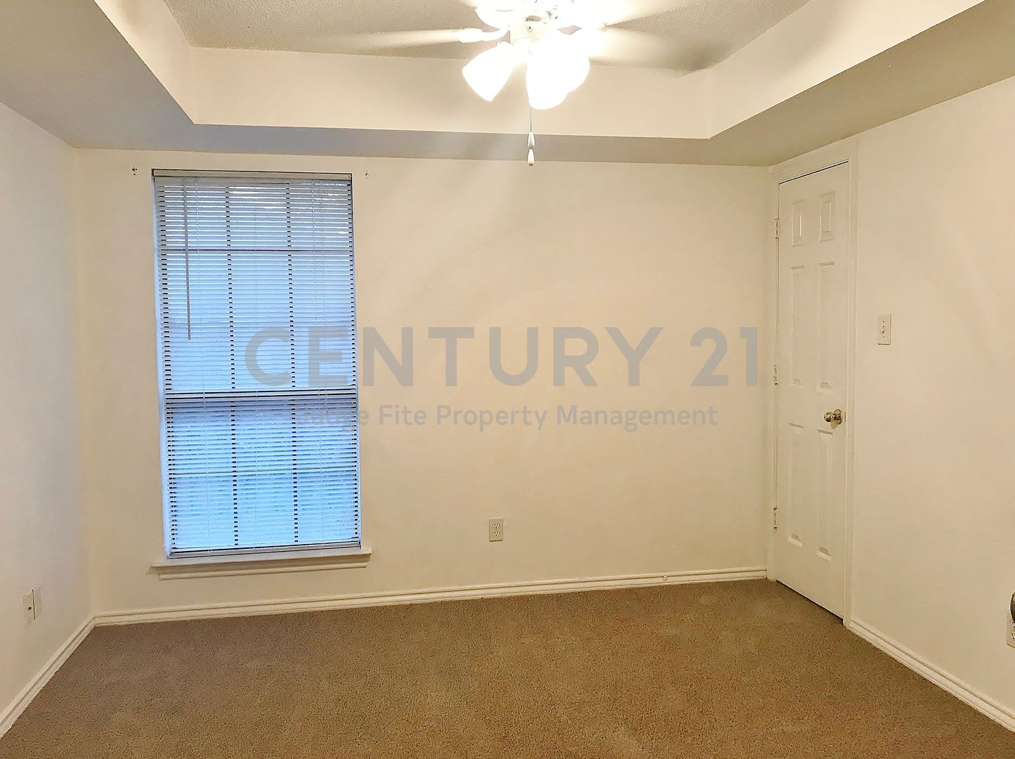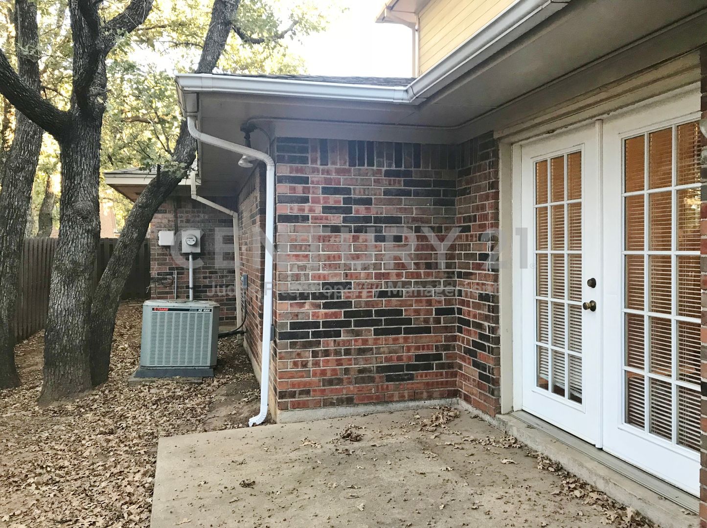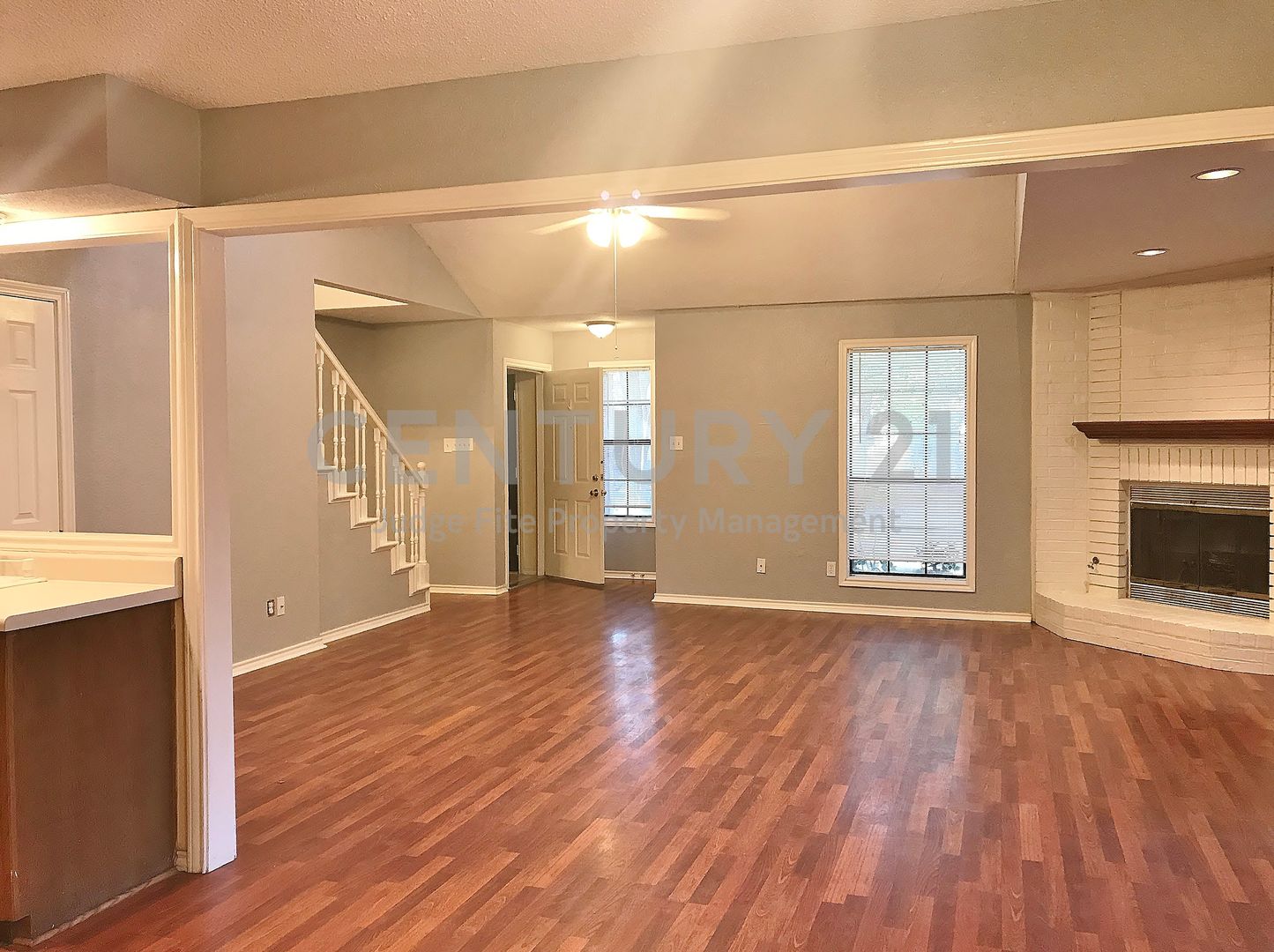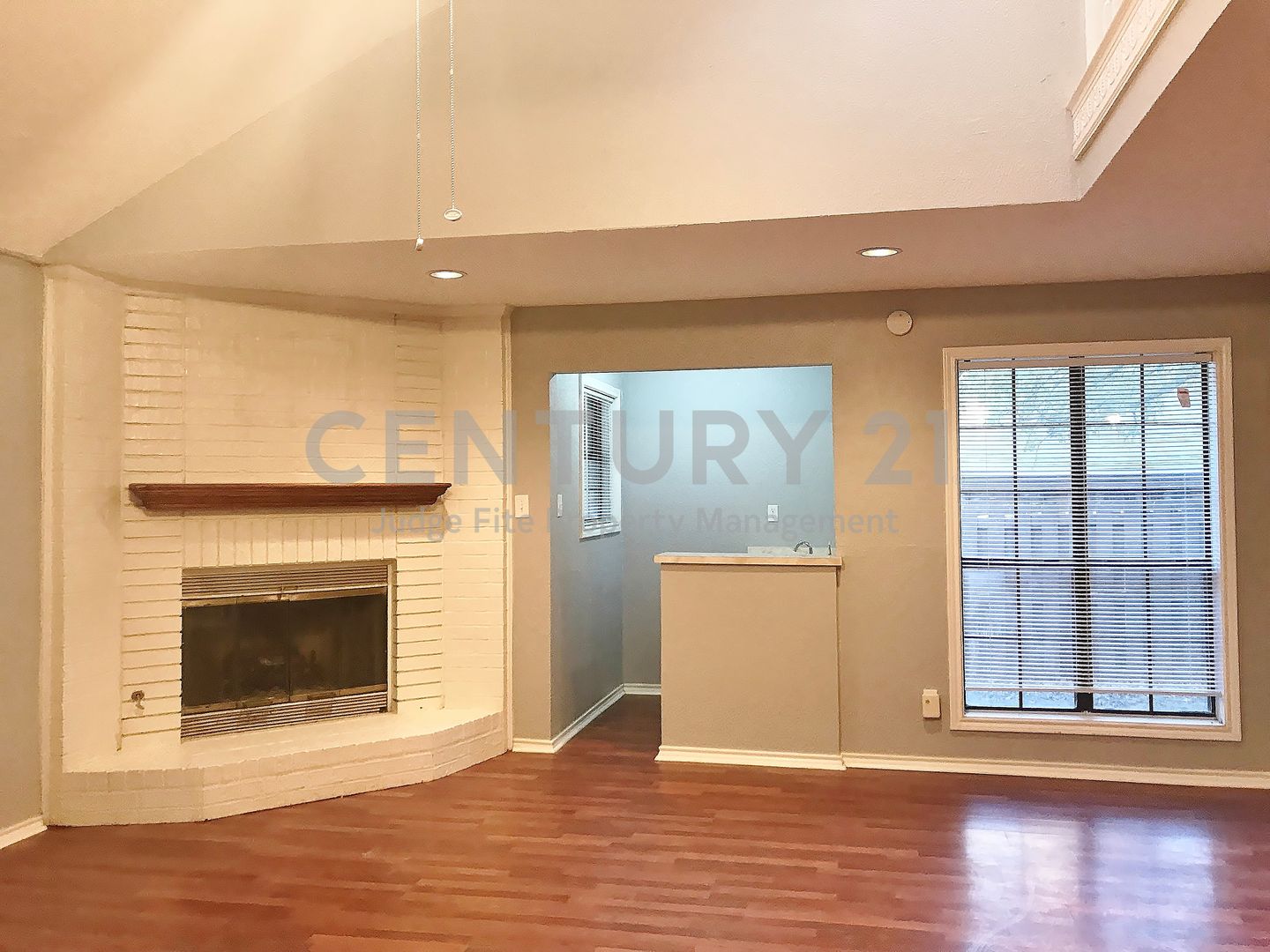 Spacious and unique 2-story 3/2/2 duplex in Denton. The open-concept living area features soaring vaulted ceilings, a cozy brick fireplace, and a dedicated wet bar—perfect for hosting or a quiet night in. Natural light floods the home through well-placed skylights, highlighting the wood-style flooring that flows throughout the main level. The kitchen is designed for efficiency with ample cabinetry, and appliances including a built-in microwave, dishwasher, stove and refrigerator. Enjoy a private retreat on the second floor in the lofted primary with double doors overlooking the living area, a large walk-in closet, an ensuite bath with a soaking tub, and a private balcony. Two additional well-sized bedrooms provide plenty of space for family, guests, or a home office. Nestled under mature shade trees with a private, fenced backyard and a covered patio. Experience a blend of comfort and style in this one-of-a-kind gem. Schedule your tour today! Only small pets allowed with owner approval.