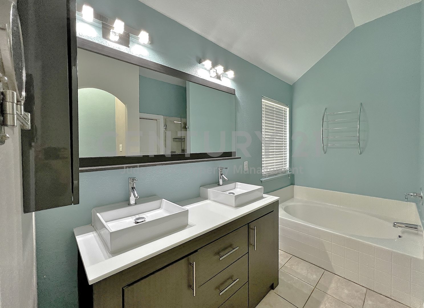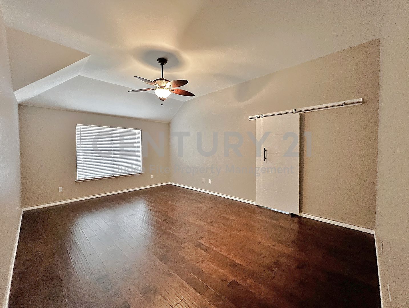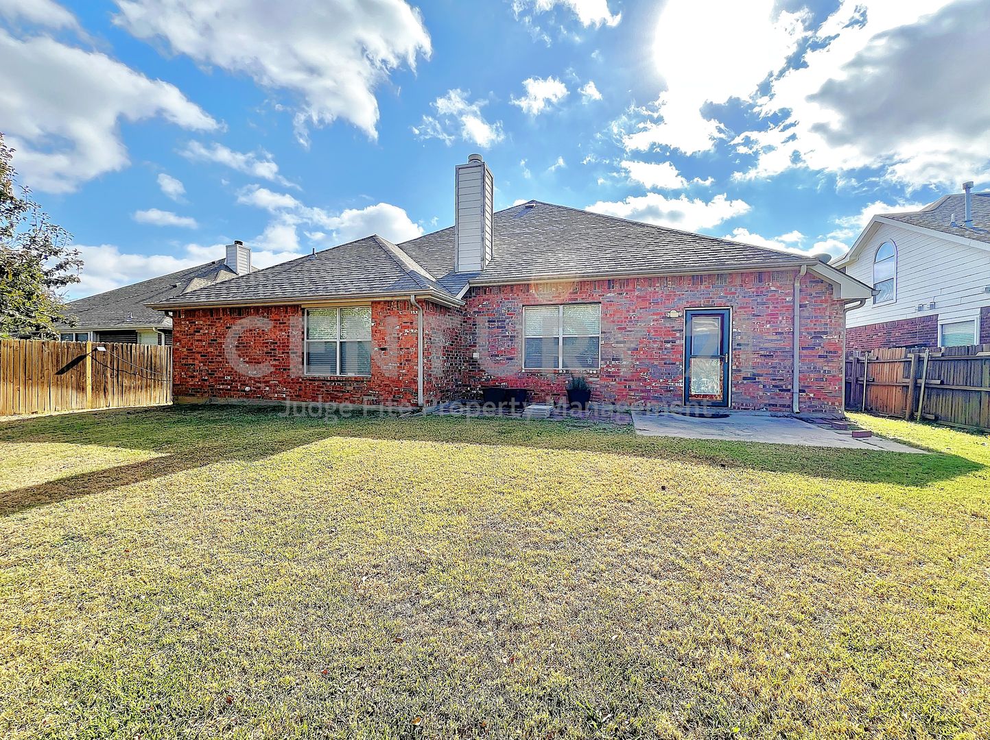Lease this stunning and spacious single-story 3-2-2 residence, featuring fantastic curb appeal, a desirable open floor plan, a fenced yard, and access to exceptional neighborhood amenities. Front entry leads to a separate formal living and dining combo area. The bright and airy family room, complete with a tile-surround fireplace, seamlessly connects the kitchen, and breakfast area. The crisp and clean kitchen boasts white shaker-style cabinets, gleaming granite countertops, sleek subway tile backsplash, and stainless steel appliances, including a dishwasher, disposal, microwave, gas cooktop with separate oven and modern pendant lighting over the generously sized island. Your spacious primary bedroom features a high ceiling and a stylish sliding barn door leading to the ensuite bathroom. Relax in the spa-like bathroom which includes a modern vanity with dual sinks, a large soaking tub, and a separate, frameless glass shower. Step outside to the fenced backyard with open patio and large grassy area, great for relaxing or entertaining. Residents enjoy access to a community pool, a neighborhood park, and a playground. This home perfectly blends modern amenities with classic comfort. Don't miss the opportunity to lease this beautiful home in a highly desirable neighborhood! Schedule your tour today! Owner must approve all pets.