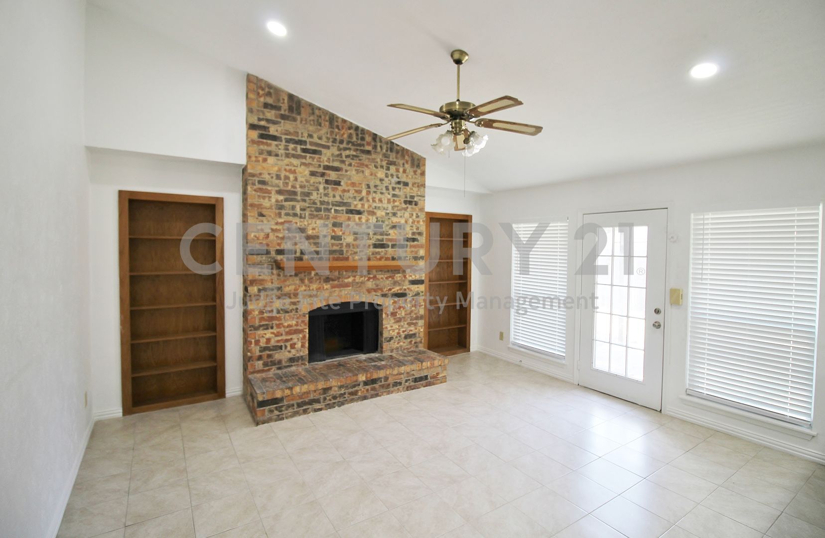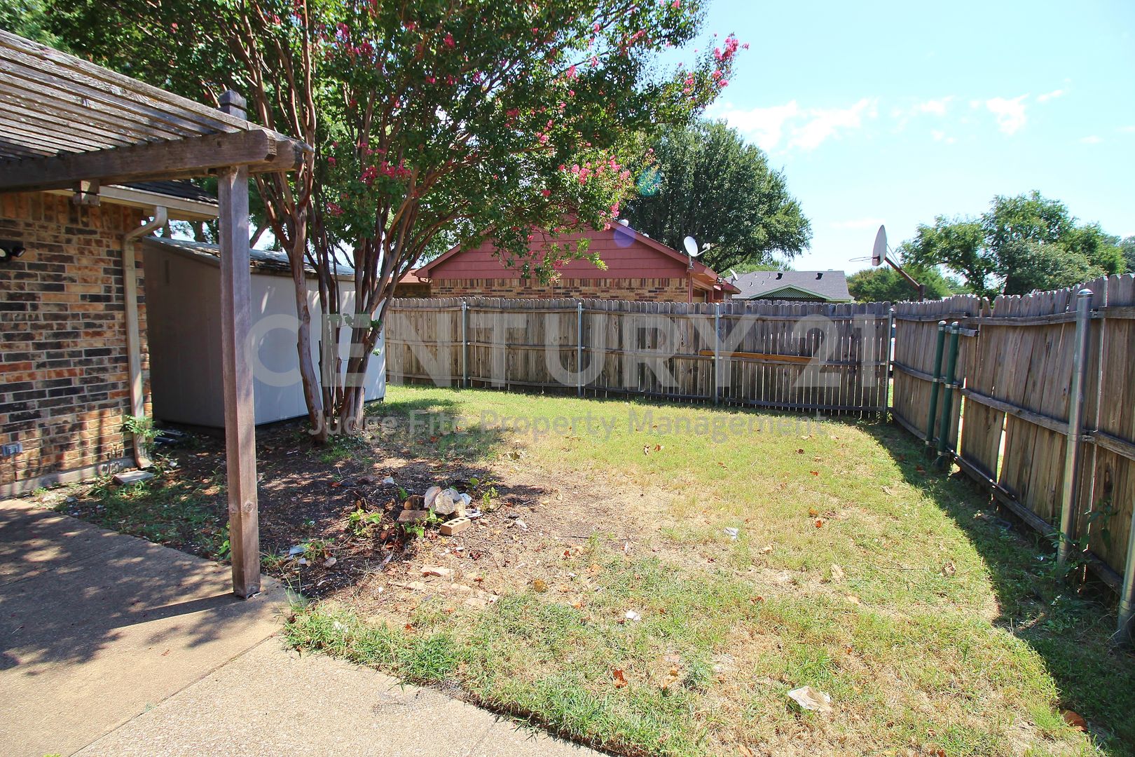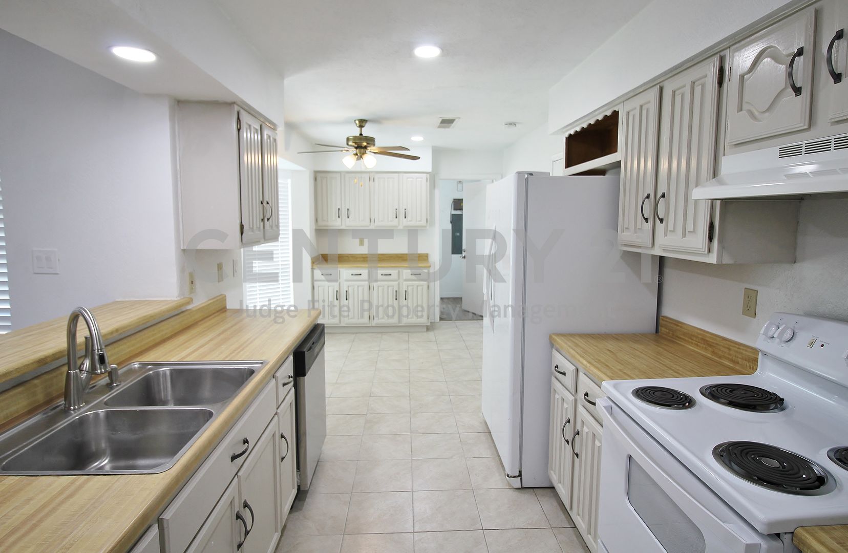 This residence offers 4 bedrooms and 2 full bathrooms, encompassing approximately 1,755 square feet of living space. The home features an inviting front porch leading into an open living and dining area with vaulted ceilings, wet bar and abundant natural light. The kitchen is comes equipped with a dishwasher, electric range open to a bay windowed breakfast nook, adjoining a second living area that includes a brick fireplace flanked by bookshelves and a wall of windows. The primary suite offers an en-suite bathroom with dual sinks and a walk-in closet. Three additional bedrooms, a full bathroom with dual sinks, and a spacious utility room with an extra sink complete the home. Additional features include a fenced backyard with pergola covered patio and a storage shed. Refrigerator, washer & dryer are also included for your convenience. Don't miss your opportunity to lease this beautiful home! Call NOW! Owner must approve all pets. 12 month lease term only.